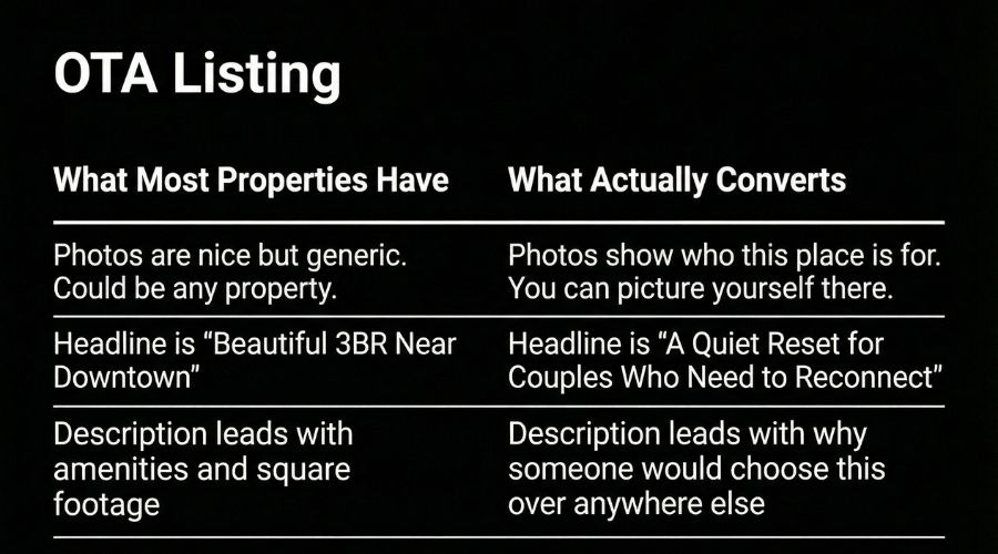 A 30‑room boutique property in a walkable neighborhood lists itself as “perfect for everyone.” Signal: zero. They rewrite with one clear lens: creative professionals who need a quiet place to focus. Same photos. Same rates. Same location. Within a few weeks, weekday bookings from that segment start to climb. The right guests begin to self‑select in.