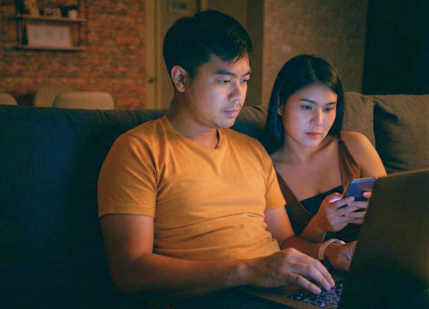 A couple is planning a long weekend. Tuesday night. Couch. Two screens.