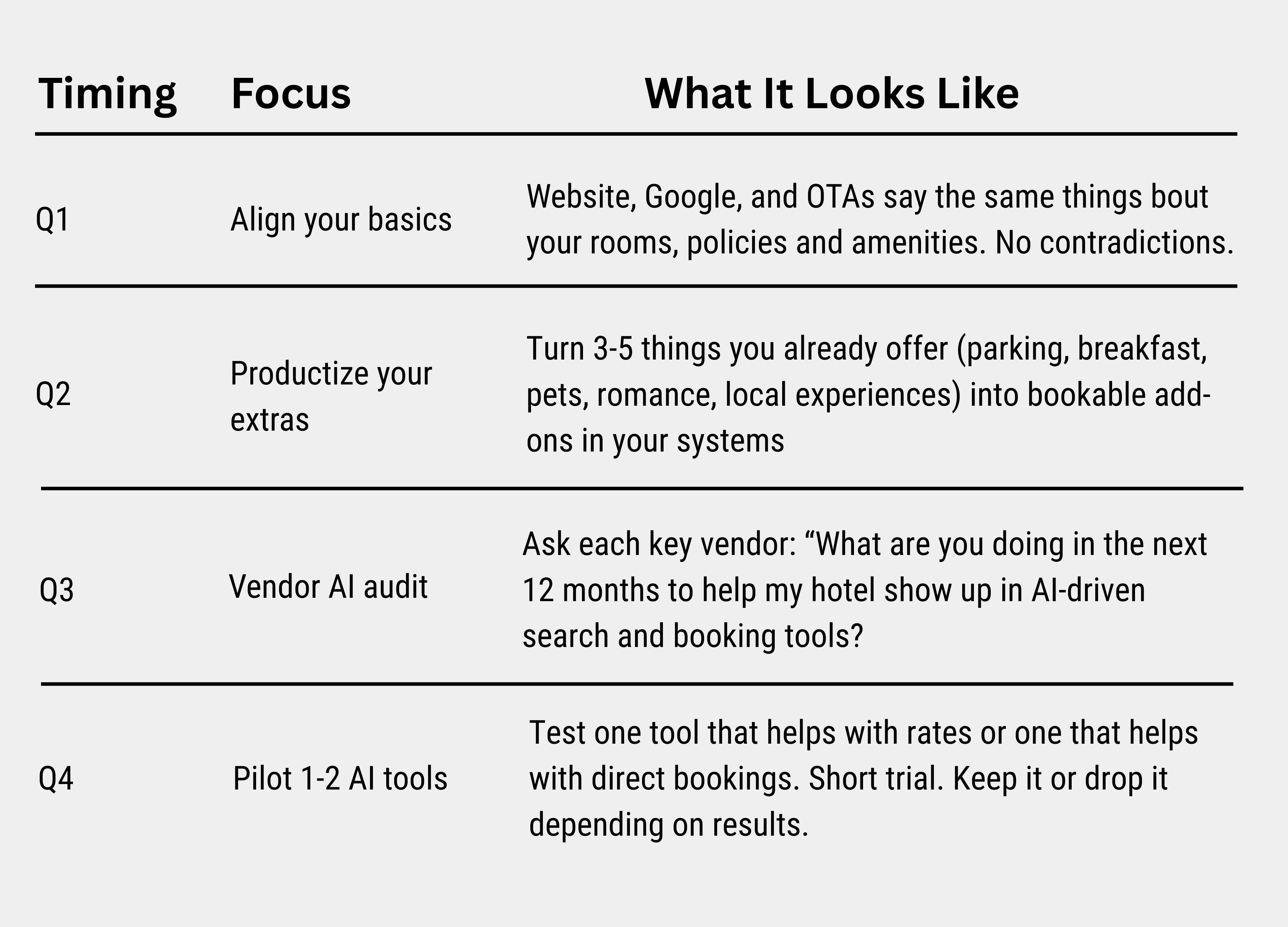 If you only do four things this year, make them these, especially if you have 10–20 rooms and a tiny team. One per quarter. Not all at once.