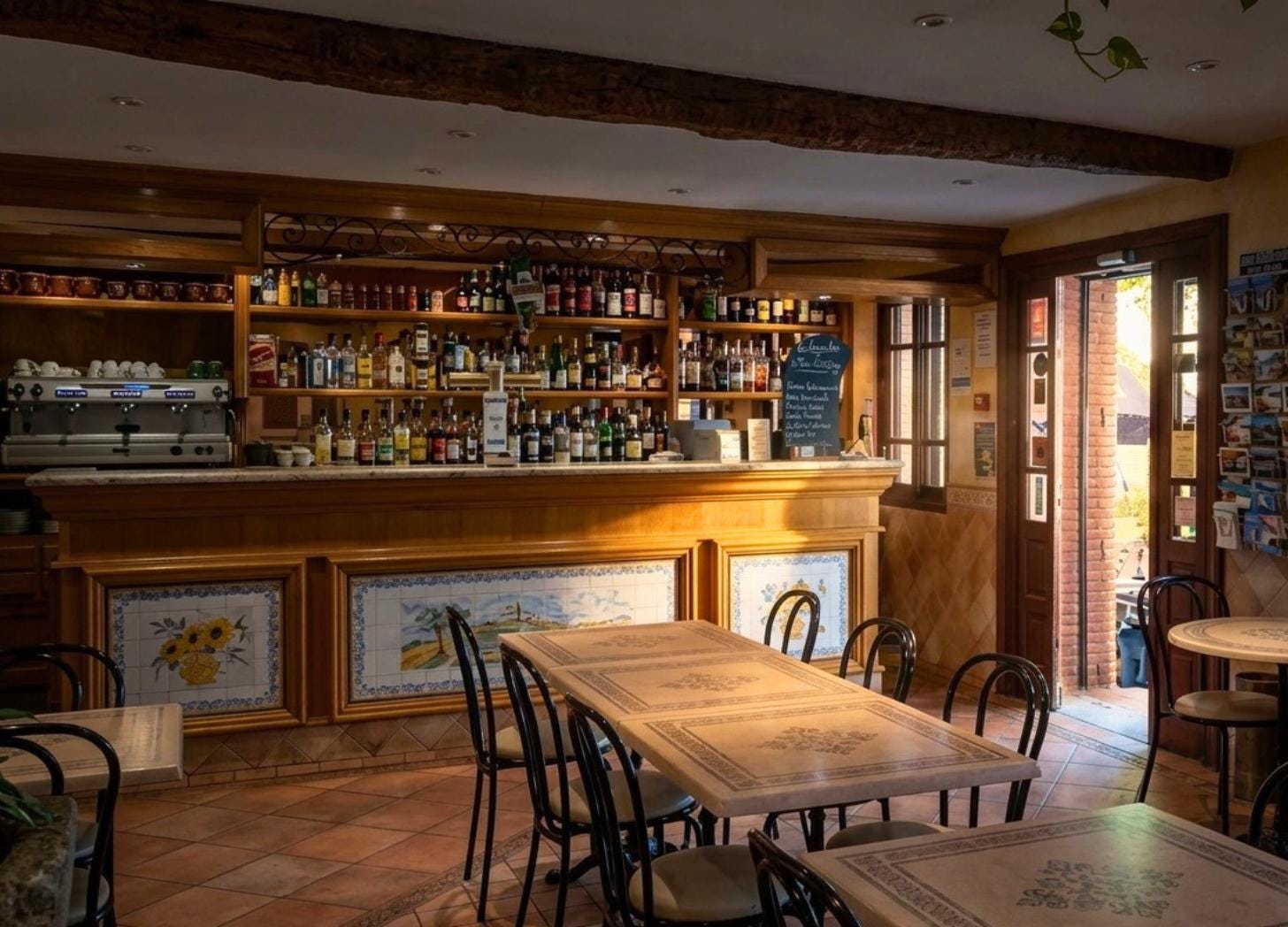 The bar area is classic with ceramic beer taps, shelves lined up with bottles, an espresso machine. Not a soul around though.